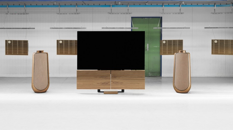 The OLED display, available in 65- and 77-inch versions, features a unique sound system with distinctive wood panelling which folds up in front of the screen when the TV is not in use.