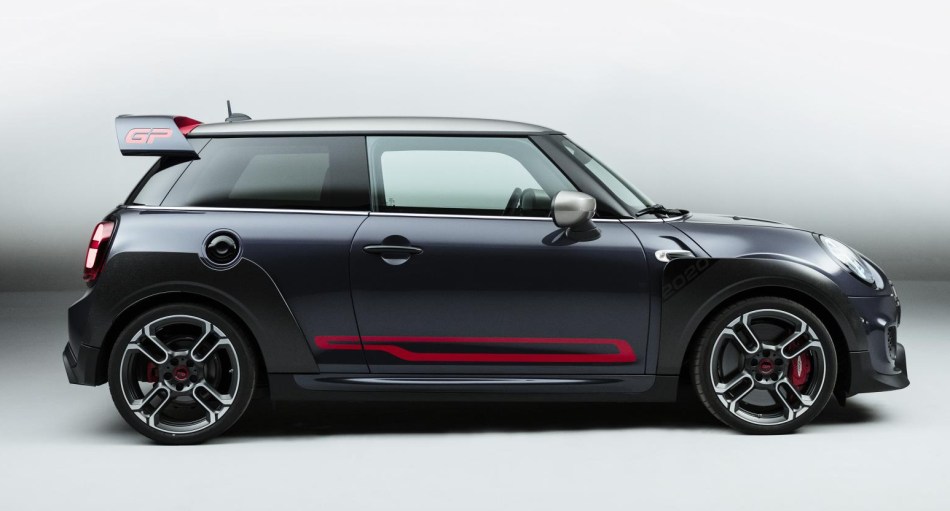 Limited to a run of just 3000, the 164mph/302bhp JCW GP (the fastest Mini ever!) is available in any colour you like, as long as it’s Racing Grey metallic, topped with a silver-finished roof and mirrors. To accent matters, natty high-gloss black replaces most of the bits you’d normally find coated in chrome on a regular Mini .