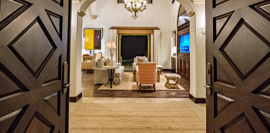 This four-bedroom, five-bathroom, 4,889-square-foot home boasts an Old World Mediterranean style, while Caribbean Island touches including double-wooden front doors and walled patio entry.