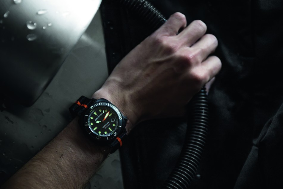 Just 13.75mm thick, the watch comes with a 41 hour power reserve. Functions include hours, minutes, central seconds, black date at 4 o’clock, and indication of immersion time on unidirectional, anti-corrosion black matte ceramic bezel