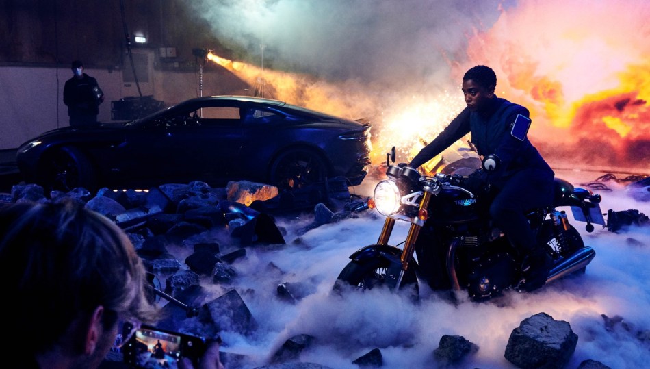 The shots feature Lashana in one of her costumes from the movie, alongside an Aston Martin DBS Superleggera and Triumph Thruxton RS motorcycle.