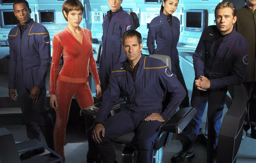 Inspiration for Virgin Galactic? The crew of the original USS Enterprise pose in Federation jumpsuits
