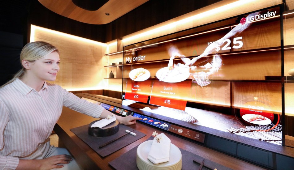 Visitors to LG Display’s virtual booth at CES 2021 will see how a sushi bar can utilise a 55-inch transparent OLED display as a high-tech partition, to deliver menu information with clear image quality while maintaining a connection between those on both sides of the screen. As you wait for your order, it can also display entertainment or news, while at the same time viewing the chef preparing their food can be seen on the other side of the display.