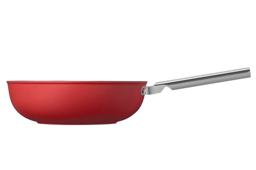 The Smeg frying pan has been equipped with a long stainless-steel handle to provide extra control during cooking; a vent hole in the flat lid of the Smeg casserole dish prevents over-boiling or rattling.
