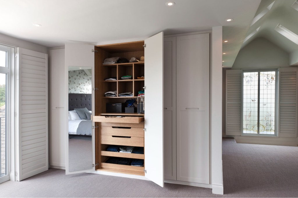‘When possible, use the full height walls of the room to build hanging wardrobes, placing drawers and shelves in the lower parts of the room under eaves.