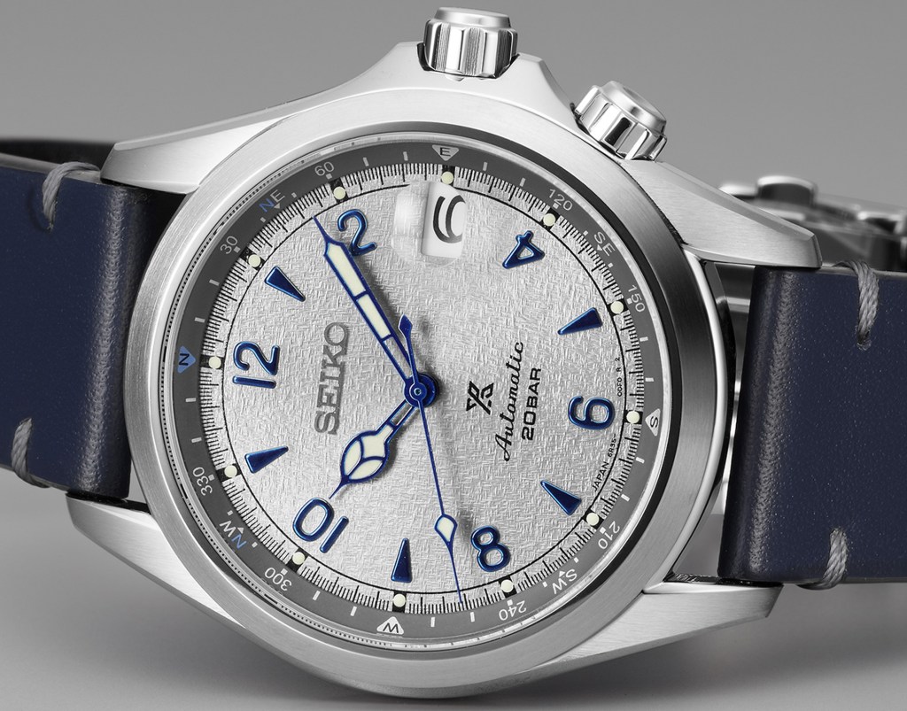 The grey textured dial of the Seiko Alpinist emulates a rock face