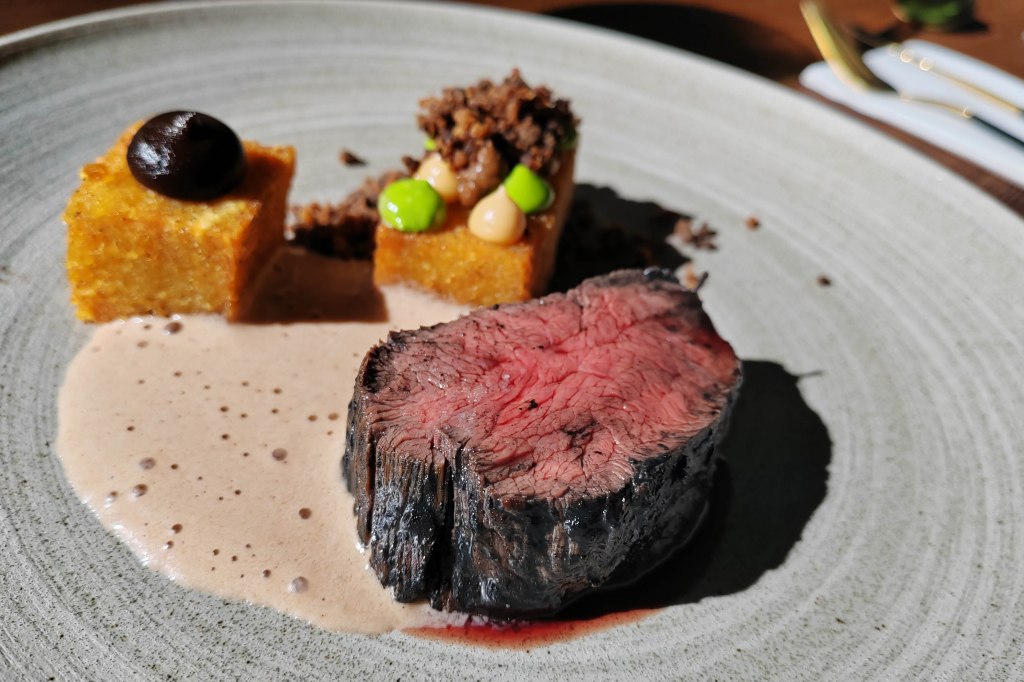 The starter is a seared Orkney scallop, with bottarga, sea herbs, compressed cucumber and truffle. It’s followed by a roast fillet of Orkney aged beef, brushed in charcoal mustard, with Tattie and Neep terrine and a Highland Park 18Yo & pink peppercorn sauce foam.