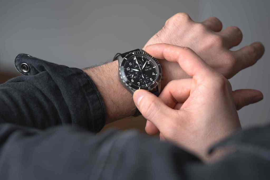 The 43mm stainless steel case of the Kiel Sport chronograph boasts a dark sandblasted surface, creating a bold and monochromatic appearance. This surface treatment not only minimises reflections but also pays homage to Laco’s pilot watch heritage, a design choice that effectively bridges the gap between tradition and innovation.