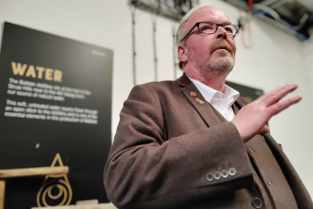 Retiring from the whisky industry after 35 years, 18 of which have been spent helming the distillery he lives just down the road from, he recounts highlights to a privileged group of invited guests, and praised colleagues.