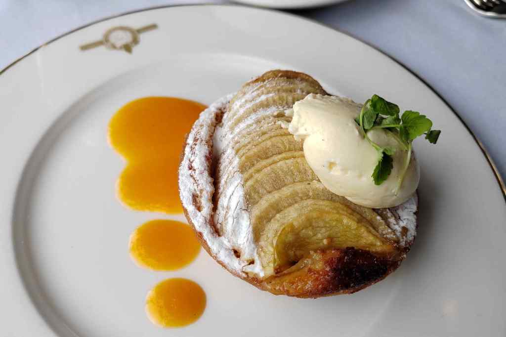 Desert is an apple and vanilla tart, with cream, apricot glaze and fresh lemon balm. Chocs and coffee follow.