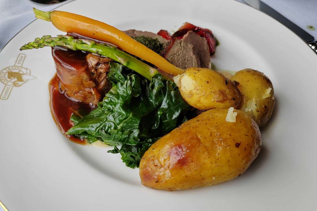 The star of the show is a duo of Kent Downs lamb. This beautifully cooked roast rump and braised shoulder is dressed with celeriac puree, English asparagus, a baby heritage carrot, kale and redcurrant jus.