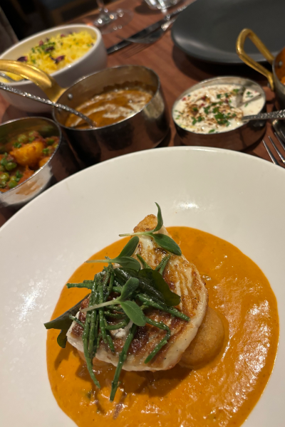 By the time mains arrive, we’re far from hungry – but they cannot be missed. Like a typical curry house, albeit elevated to a fine dining degree, we are served main options of a rich, classic North Delhi butter chicken in tomato sauce and pan seared turbot with fried idli in a coconut curry sauce, with a host of favourite Indian trimmings: moreish aloo and mutter, fragrant saffron rice, light and airy naan and a black daal so delicious I couldn’t stop spooning it on to my plate – no matter how full the multi-course celebration had me feeling.