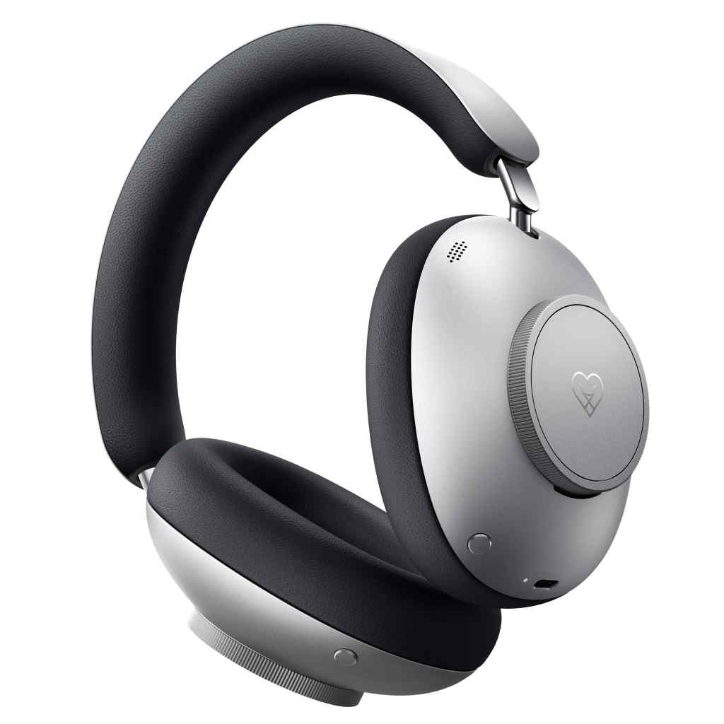 Over-ear, fold-flat design crafted with anodised aluminium, leather cushions, and sustainability in mind – repairable, replaceable, and upgradeable components.