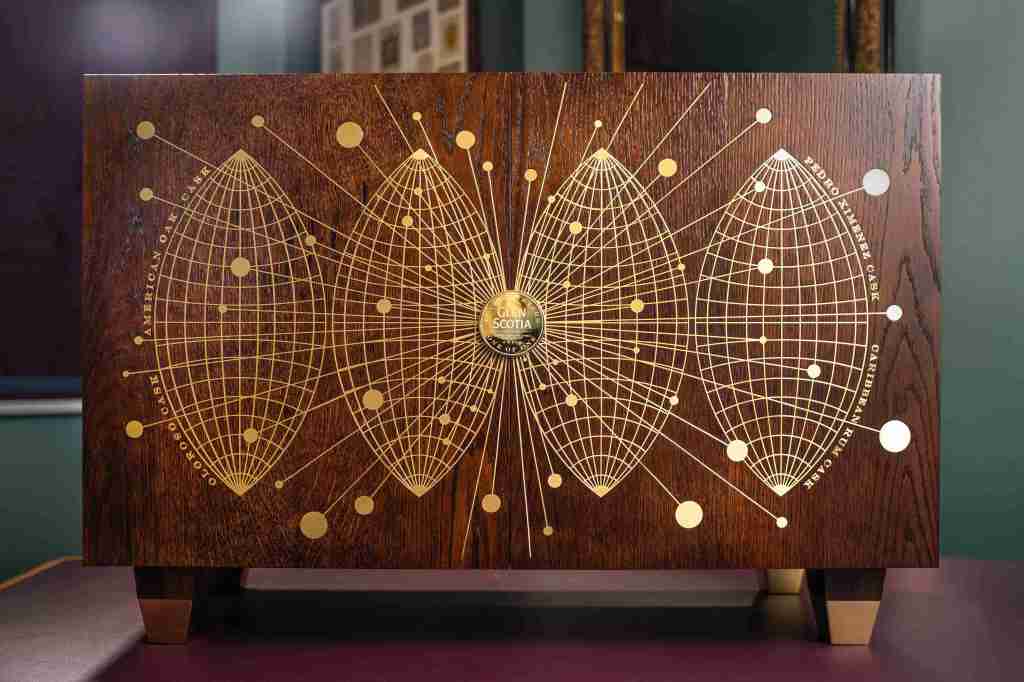 The decanters are housed in an oak display cabinet with intricate brass inlays depicting the ‘four quarters’ of the world, a nod to Campbeltown’s historic trade links. Inside, the cabinet features a soft fabric lining, with individual leather cradles for each decanter. A concealed drawer contains an engraved brass plaque telling the collection’s story.