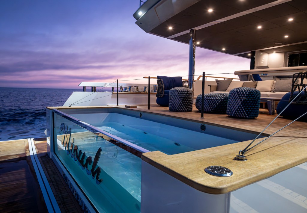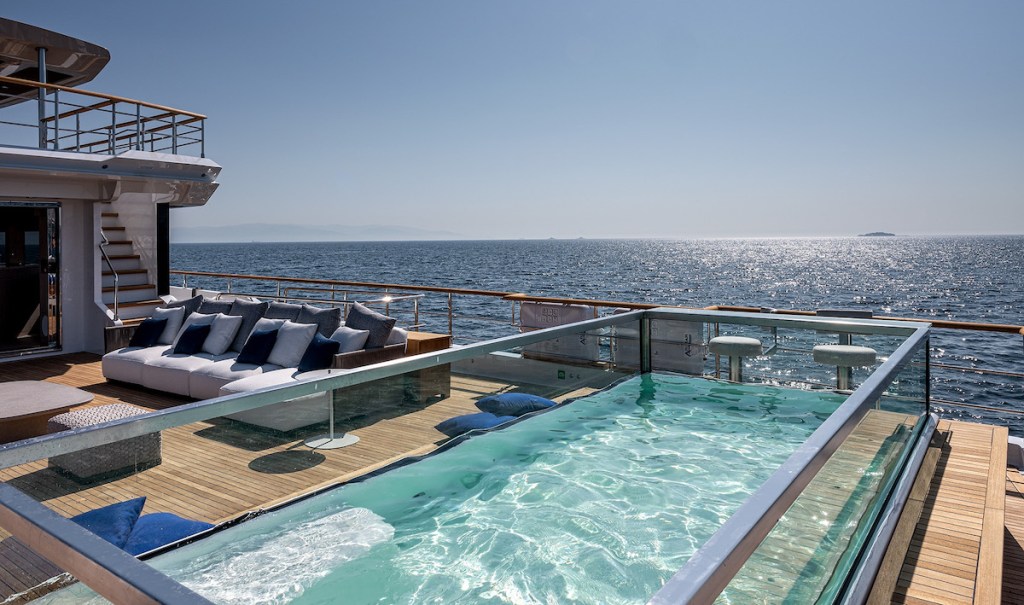 At the centre of the yacht’s design is an expanded aft deck that acts as its main social hub. This area stretches full-beam and includes a large outdoor dining space, a bar, relaxed lounge seating and a pool with a glass transom.