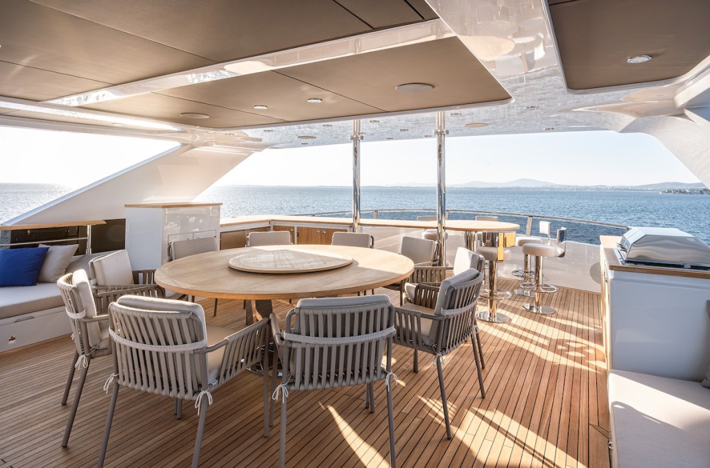 The aft deck serves as the yacht’s main social hub, featuring alfresco dining, a lounge, bar and aft pool with a glass transom.