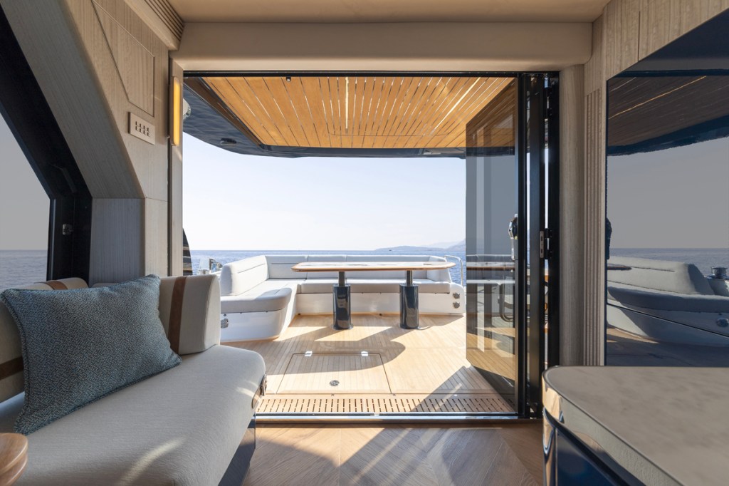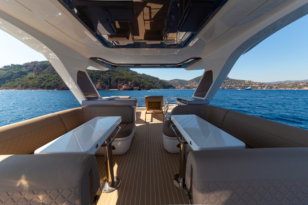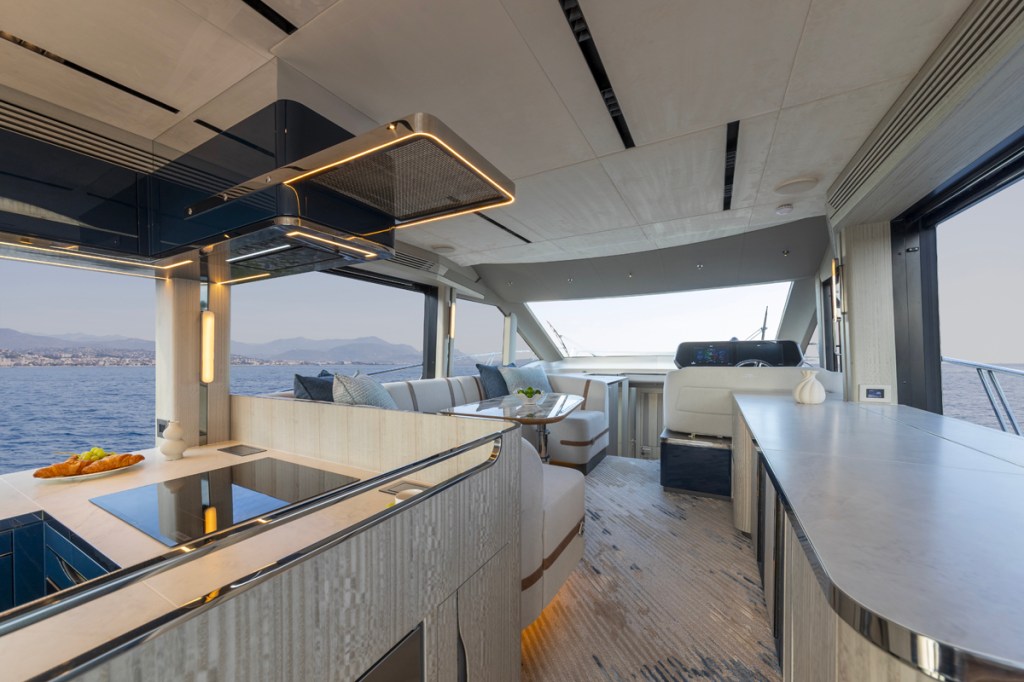 Galeon’s Beach Mode makes an appearance too. At anchor, the cockpit can be expanded via opening balconies, increasing usable deck space and creating a closer connection to the water, ideal for an afternoon swim, paddleboard or sundowner with friends.