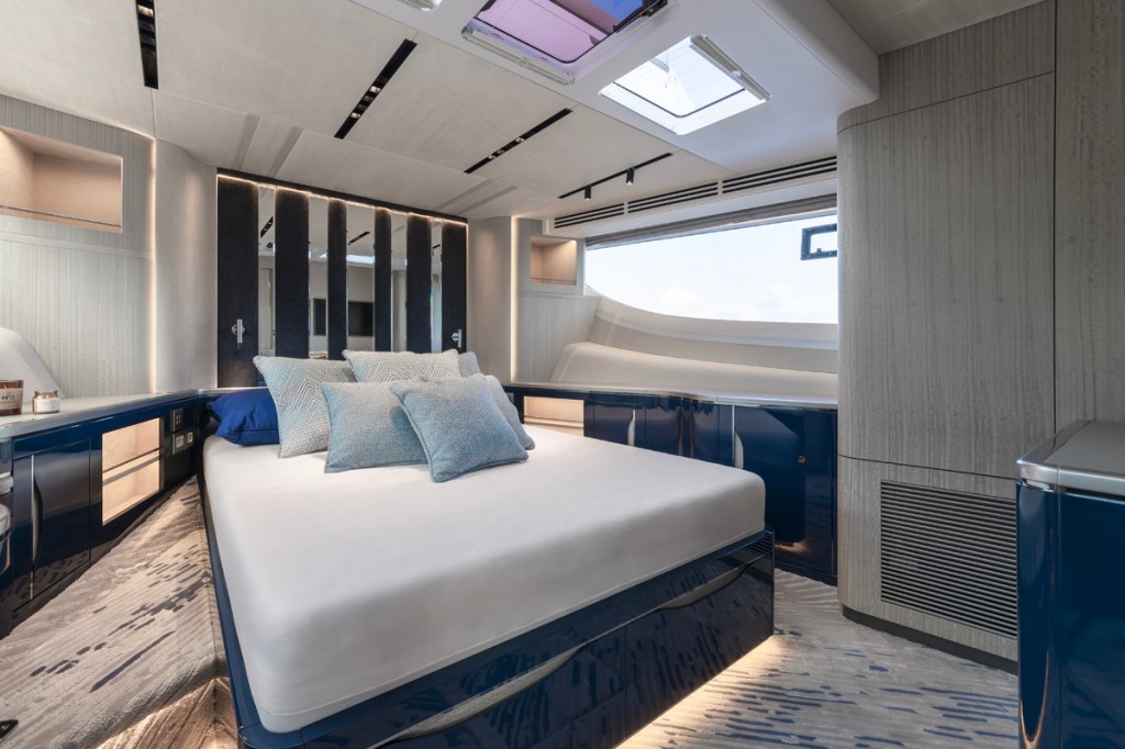 Below deck, accommodation is arranged for up to six guests. A full-beam master cabin takes pride of place, joined by a forward VIP and an additional guest cabin, served by two bathrooms. Headroom, storage and lighting have all been prioritised, says the ship builder.