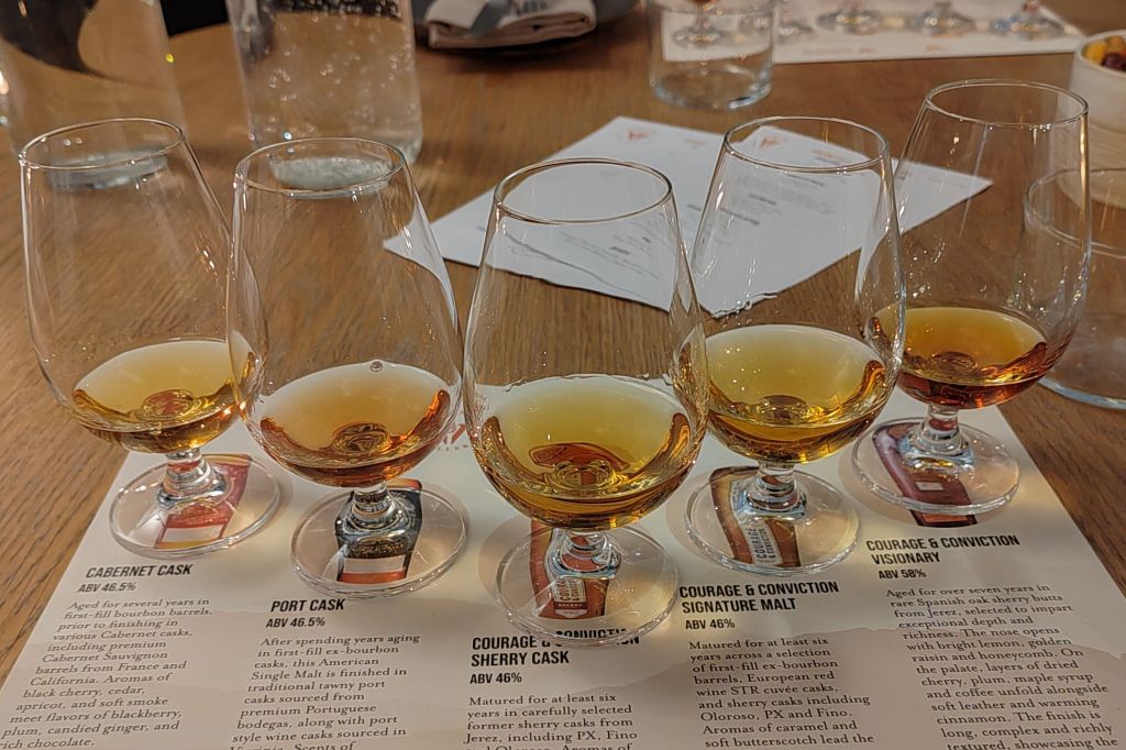 Production is organised around two complementary whisky lines. The Virginia Distillery Company (VDC) range is defined by secondary maturation and cask finishing, while Courage & Conviction focuses on primary maturation, with new make spirit filled directly into its final casks and partially managed through a solera-style system to maintain consistency.
