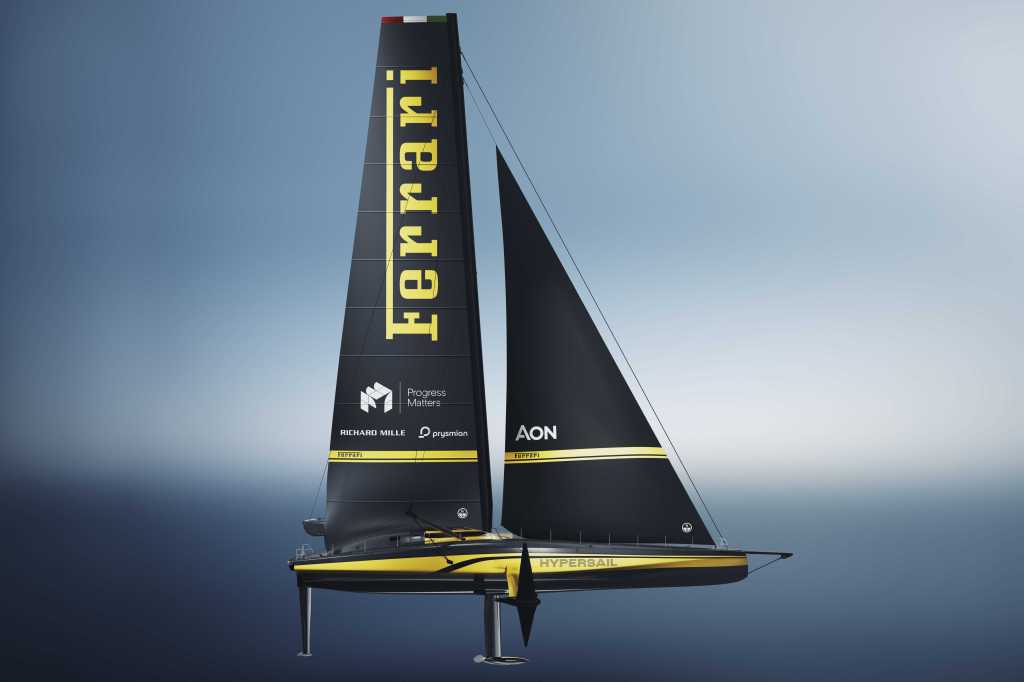 At Milan Design Week, where furniture and fashion usually take centre stage, Ferrari has unveiled its freshly liveried Hypersail, a ground-breaking 100-foot flying ocean monohull.